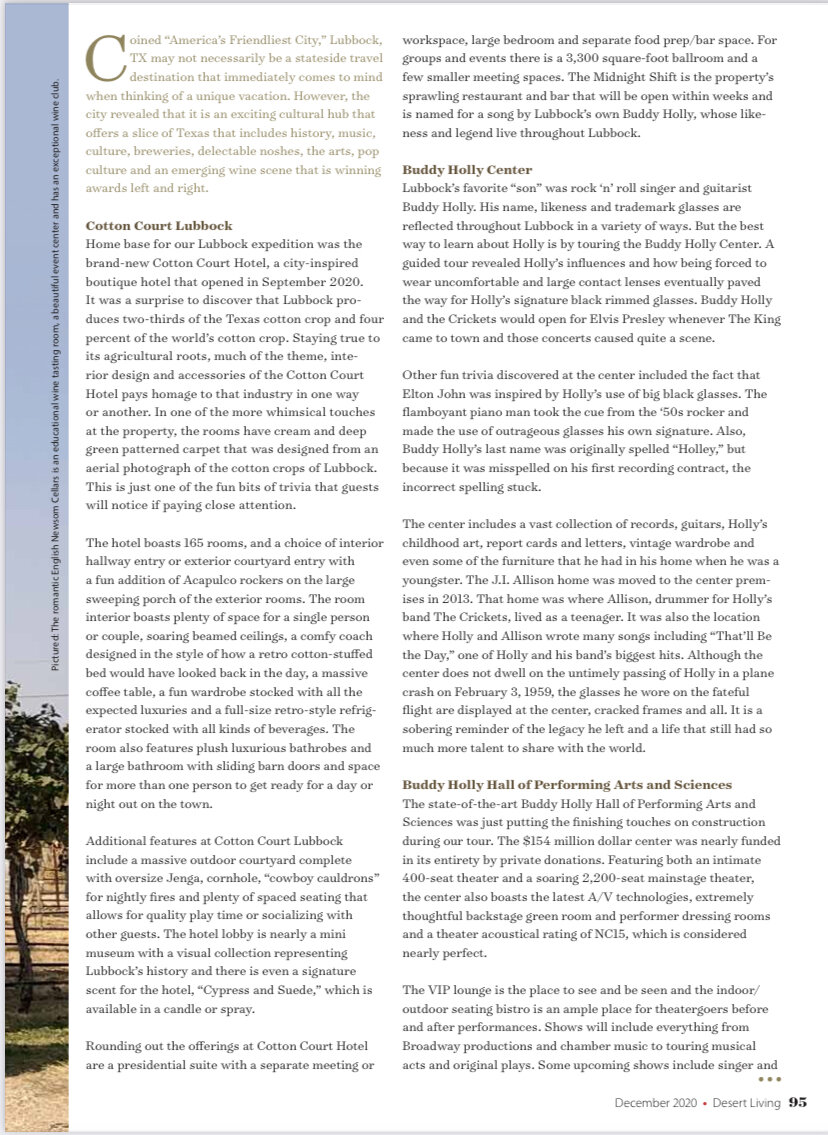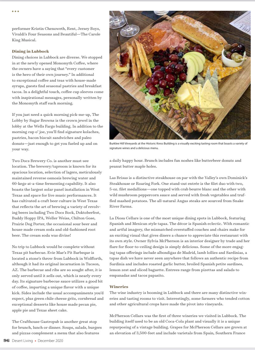 Burklee Hill Vineyards in downtown Lubbock is a family-owned restaurant and winery. Burklee Hill’s wines are locally grown from the Texas High Plains, primarily from the family vineyard established in 2002. Sitting on land that has been farmed by the Hill family for five generations, the vineyard was first planted in 2002 and now spans across approximately 50 acres.